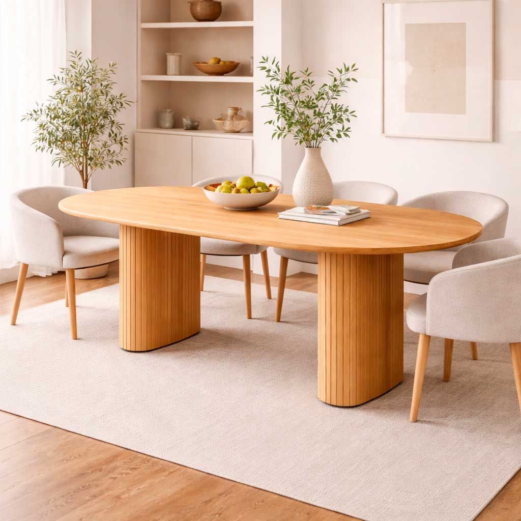 Su base con diseño de listones verticales tipo flauta y forma curva la convierte en una pieza única, casi escultórica, que eleva el nivel visual del comedor.