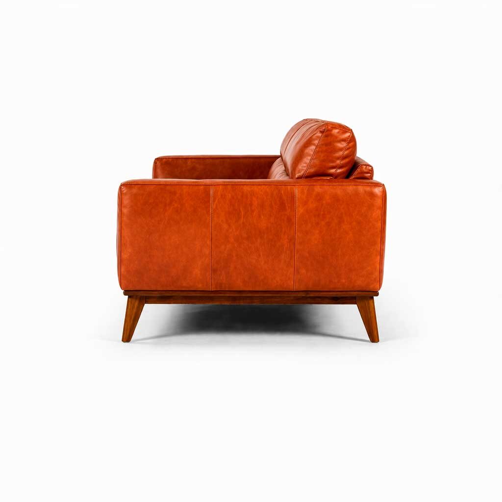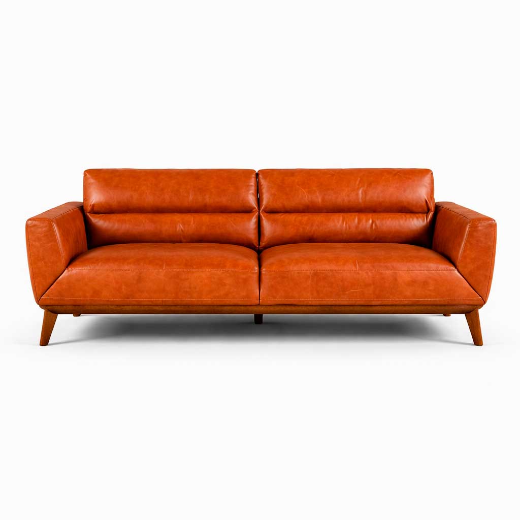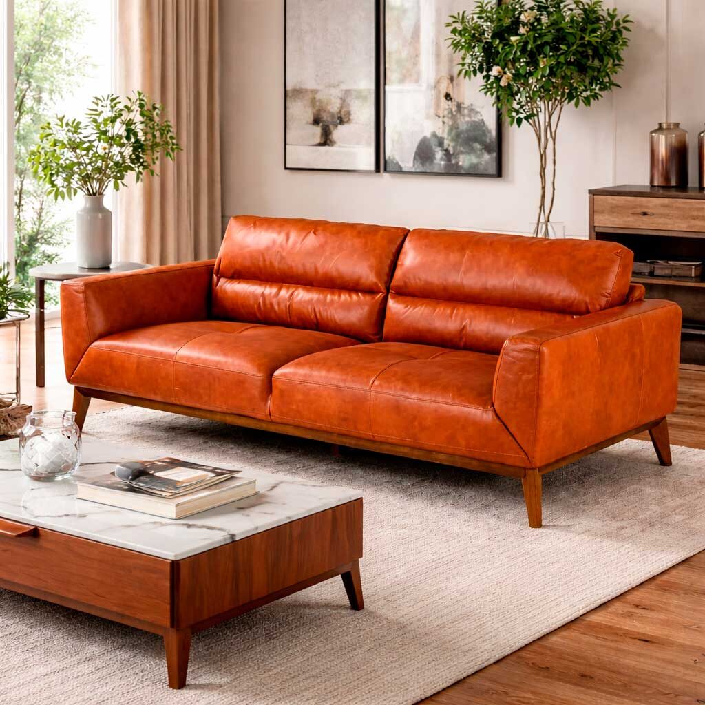 Sofá Milano de diseño escandinavo con estructura delgada, patas en madera, tapizado en cuero natural en varios colores, asiento fijo y cojines ergonómicos.