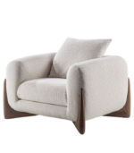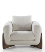 Poltrona London con curvas envolventes, base en roble, tapizado en bouclé personalizable, cojín suelto con relleno de algodón siliconado. Ideal para salas o rincones de lectura.