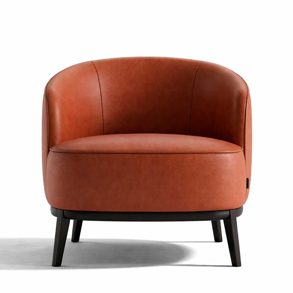Poltrona Oslo con estructura de roble, tapizado en cuero, patas de madera teñidas en ébano, ideal para estilos cálidos o minimalistas.