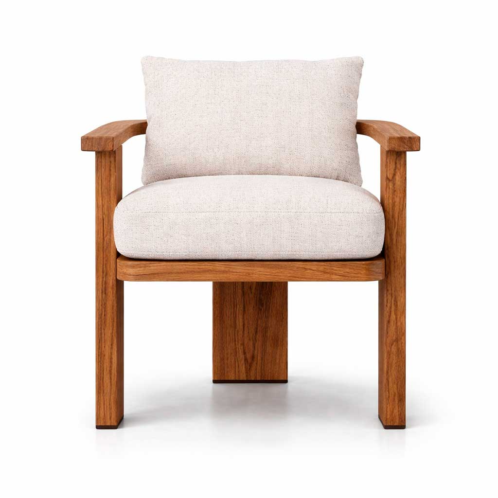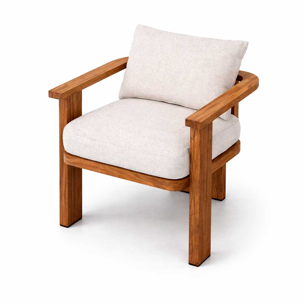 Silla Gullo elaborada en teca, ideal para exteriores. Tapizado con tela outdoor resistente a la intemperie. Estilo minimalista y elegante. Ideal para terrazas, jardines y hoteles.