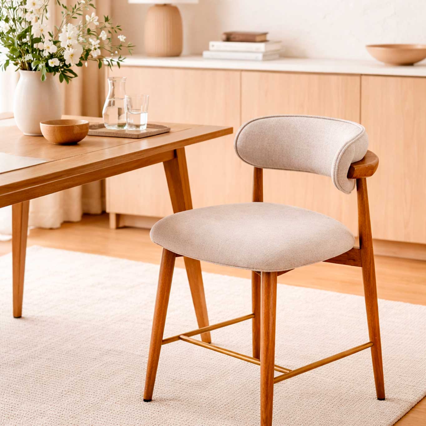 La Silla de de barra Minos combina curvas suaves y proporciones armoniosas con estructura de roble y tapizado en tela lino Premium. Espuma de alta densidad. Ideal para comedores, cafés y estudios de diseño. Estilo minimalista escandinavo.
