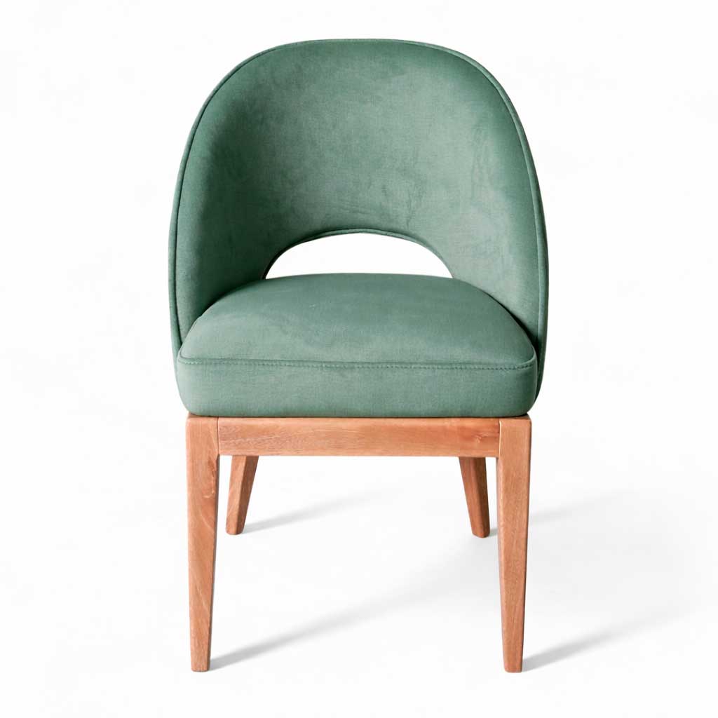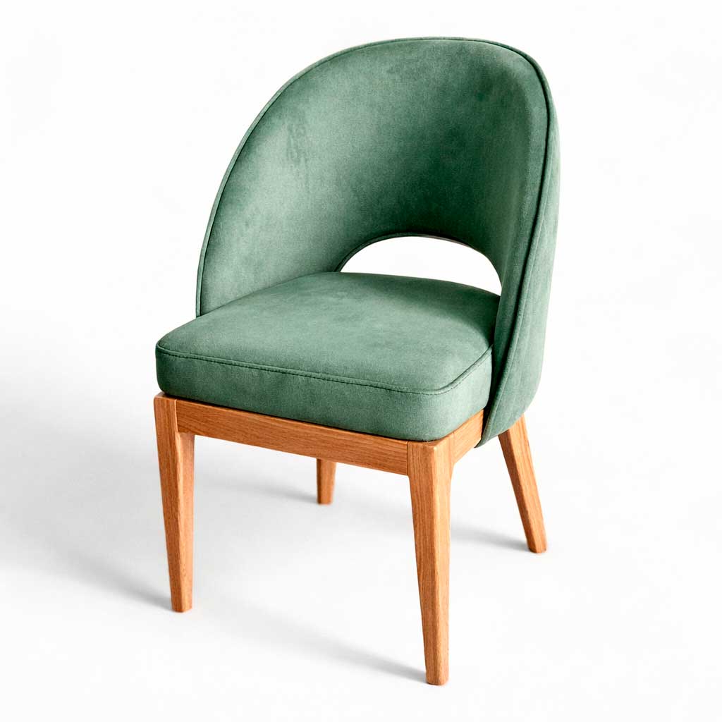 Diseño elegante con respaldo envolvente y abertura inferior para mayor confort. Tapizado en telas antifluidos de alto tráfico. Ideal para comedores modernos o salas de espera.