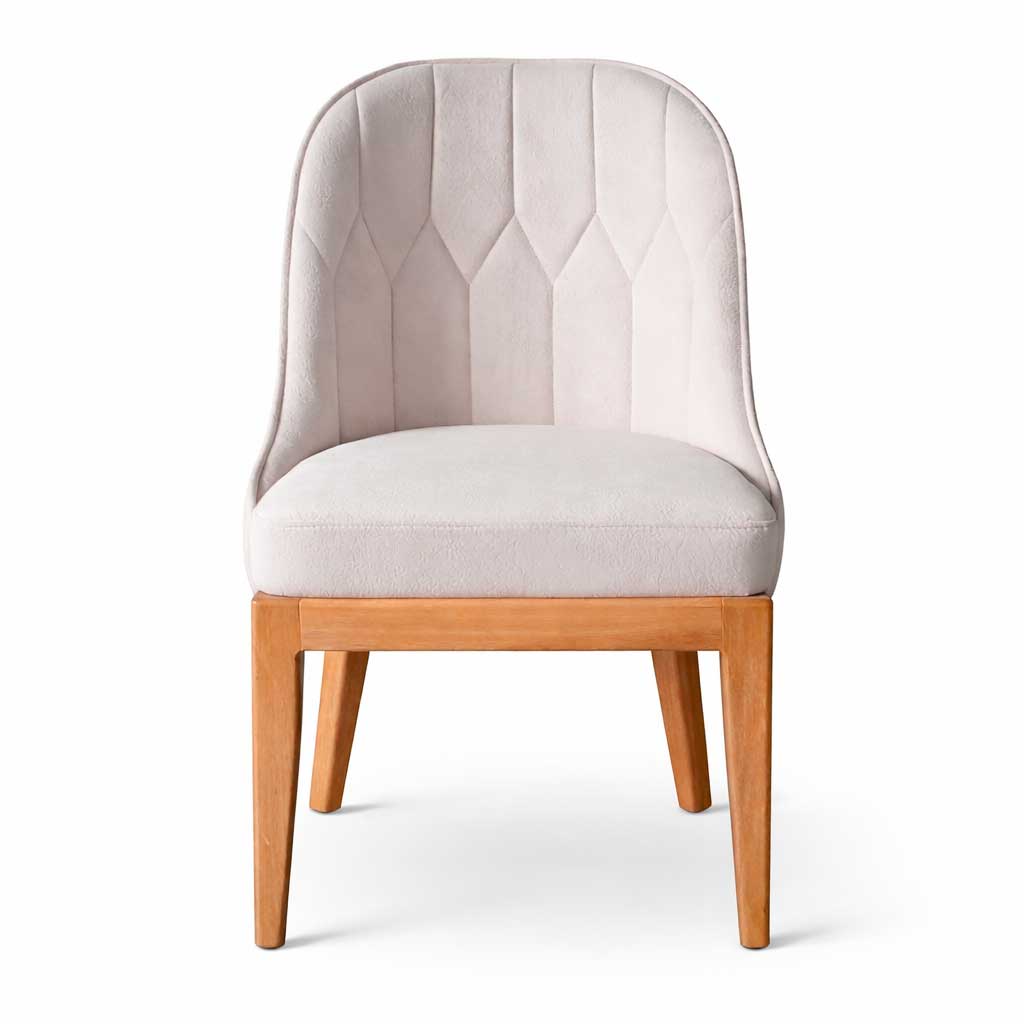 Silla Livai con estructura en roble natural, tapizado en tela antifluidos y asiento acolchado. Ideal para comedores de alto diseño, hoteles o consultorios. Elegante y atemporal.